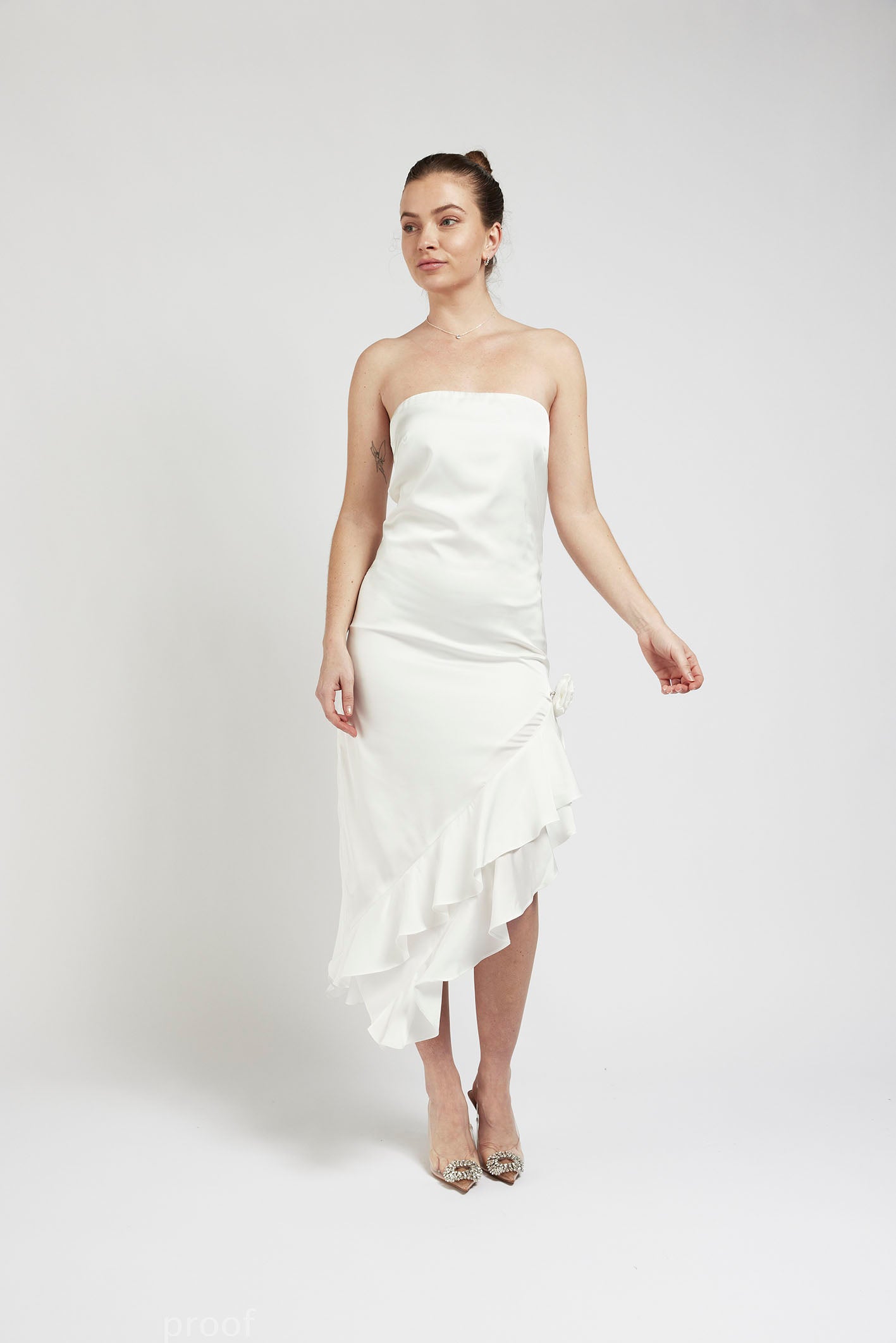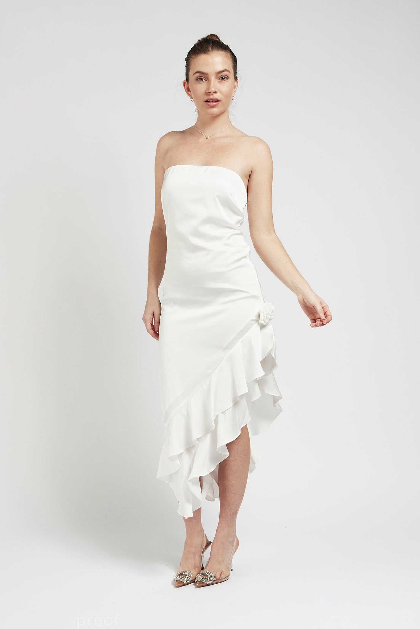 The Arya Asymmetric Ruffle Dress is the perfect combination of elegance and playfulness. Featuring a chic bandeau neckline and an eye-catching asymmetric ruffle hem, this midi-length dress is designed to make a statement. Crafted from lightweight woven fabric, it offers a comfortable, breathable fit with a flattering fit-and-flare silhouette. Whether you're attending a wedding, cocktail party, or a special event, the Arya Ruffle Dress—available in striking red or timeless white—will have you turning heads with its stylish and refined look.